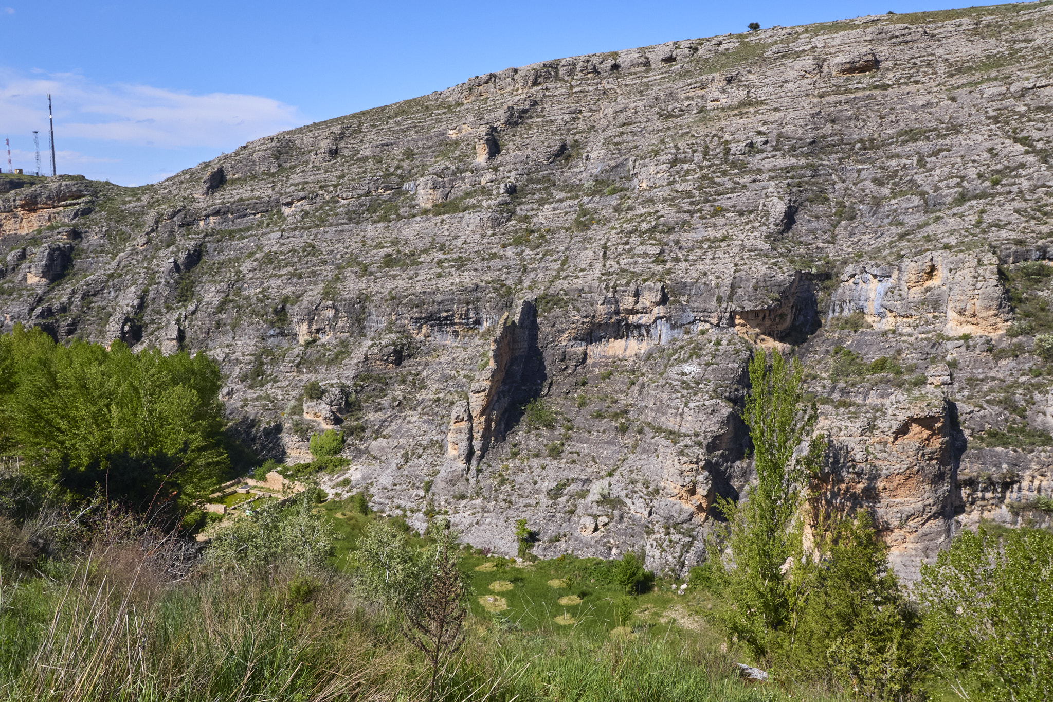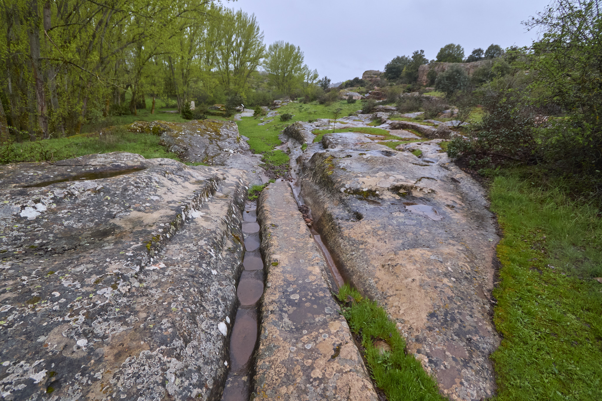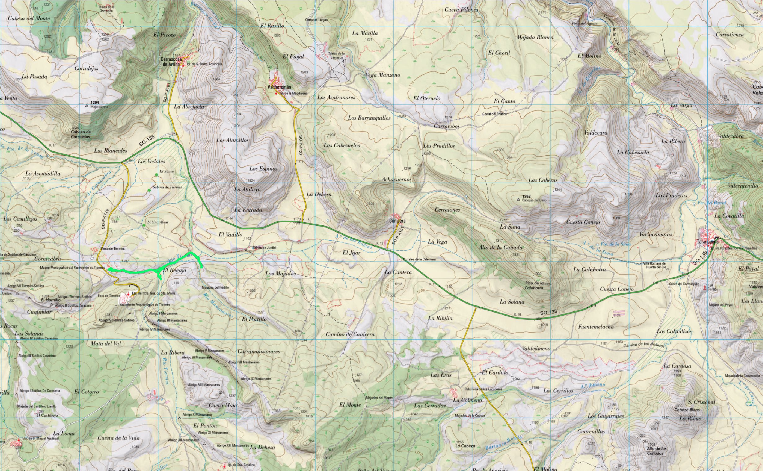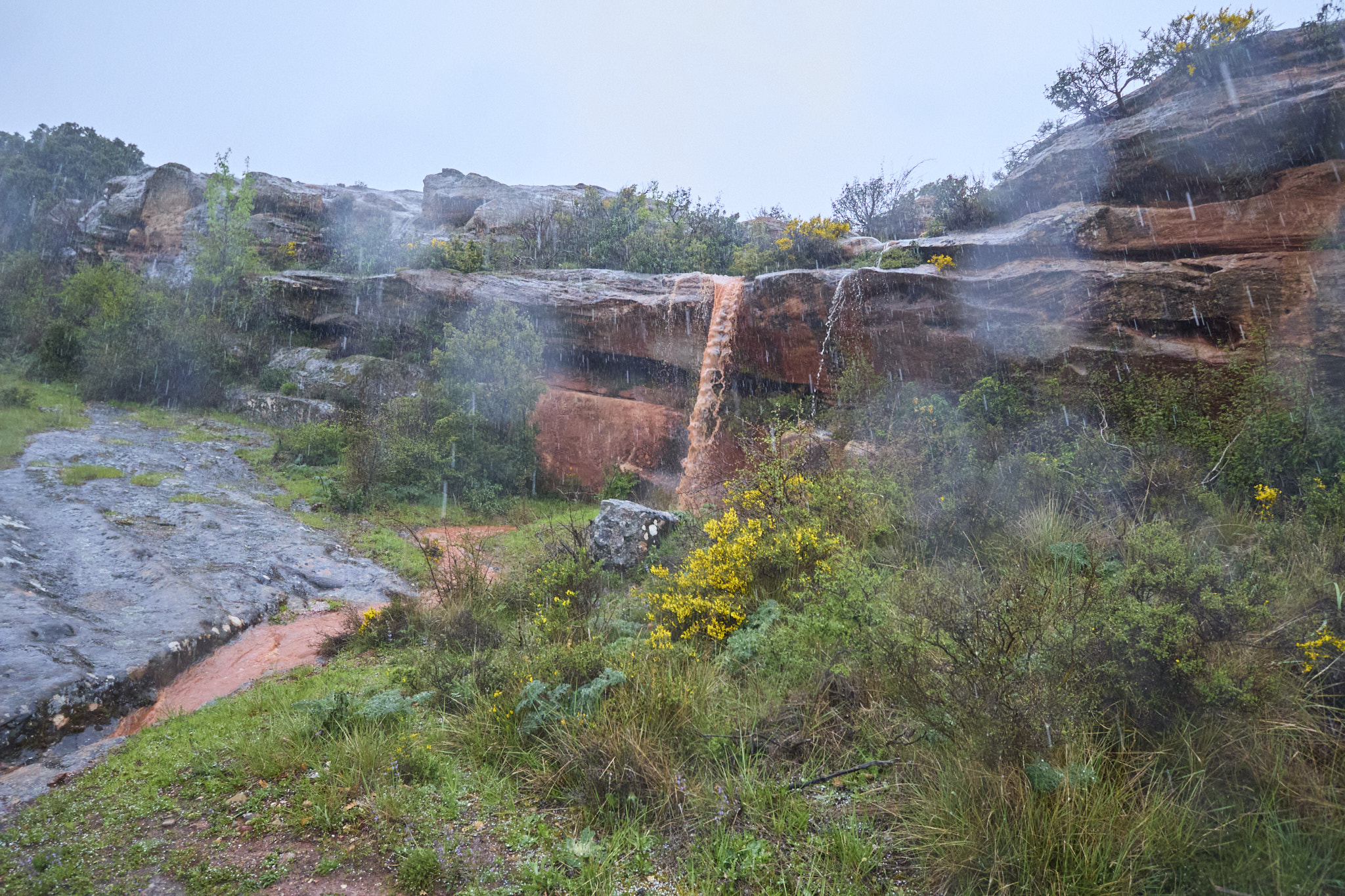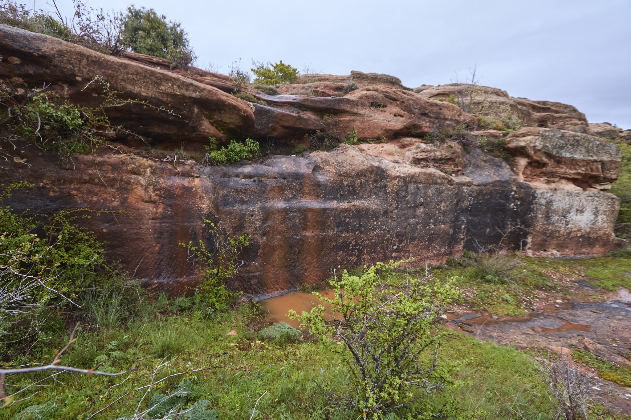 Son casi las once cuando comienza la andadura desde el aparcamiento del Museo, enfilando hacia el este junto a unos cortados de arenisca rojizos muy interesantes. Tras recorrer unos 600 m, se desvían a manderecha acercándose al río Tiermes, señalando la directora de ruta que hemos de alcanzar los cortados de la orilla opuesta. Más campos y caminos están totalmente encharcados y no encuentran el puente para cruzar el cauce, bastante torrencial.