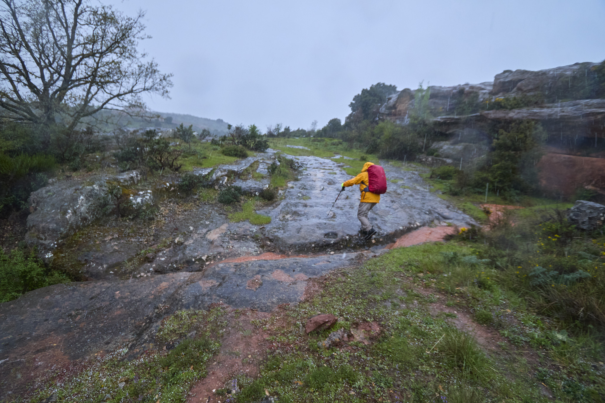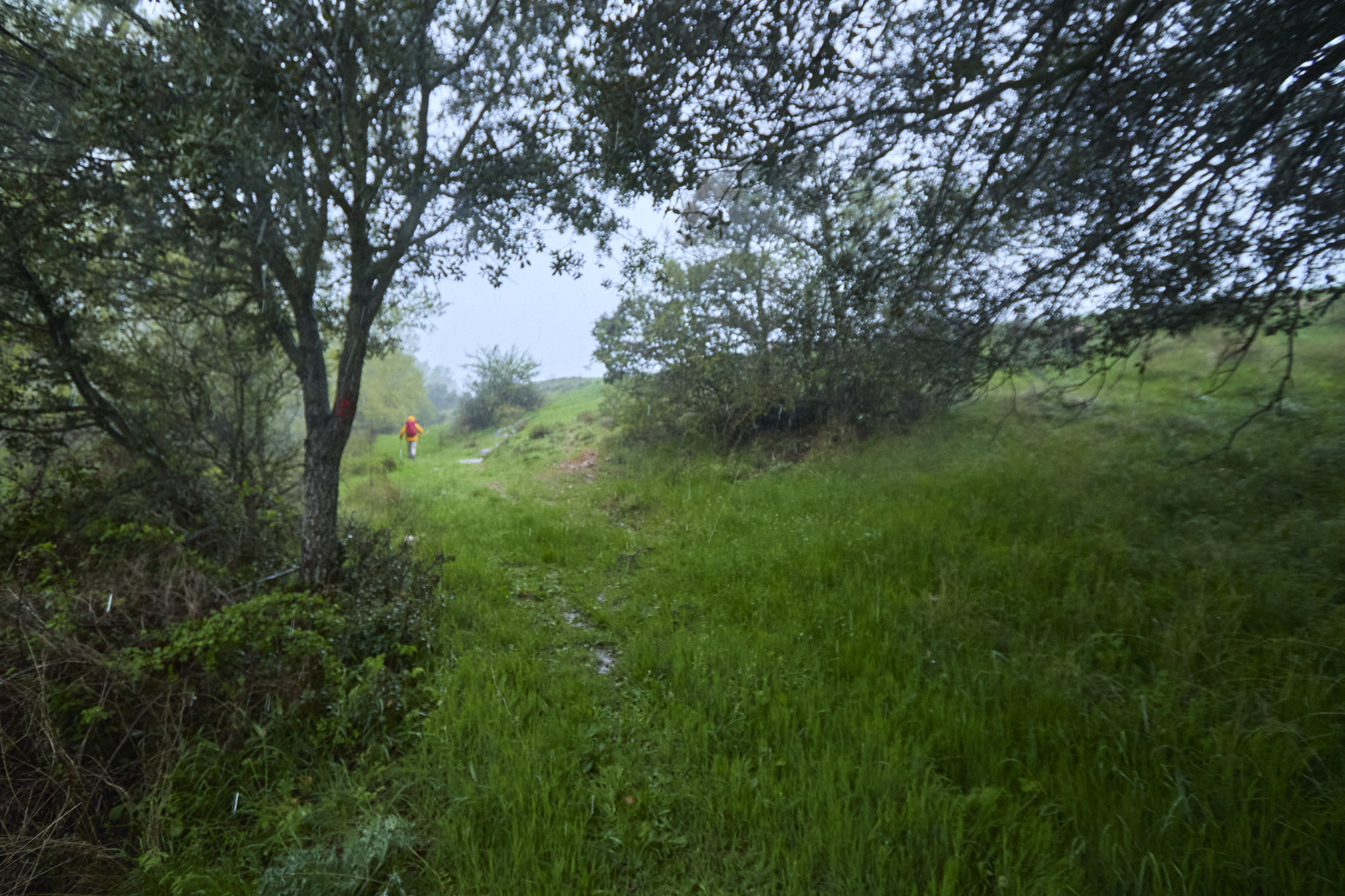 La, hasta entonces, fina e intermitente llovizna se transforma casi instantáneamente en inclemente aguacero con atronadores retumbos, que evoluciona a cruel granizada.