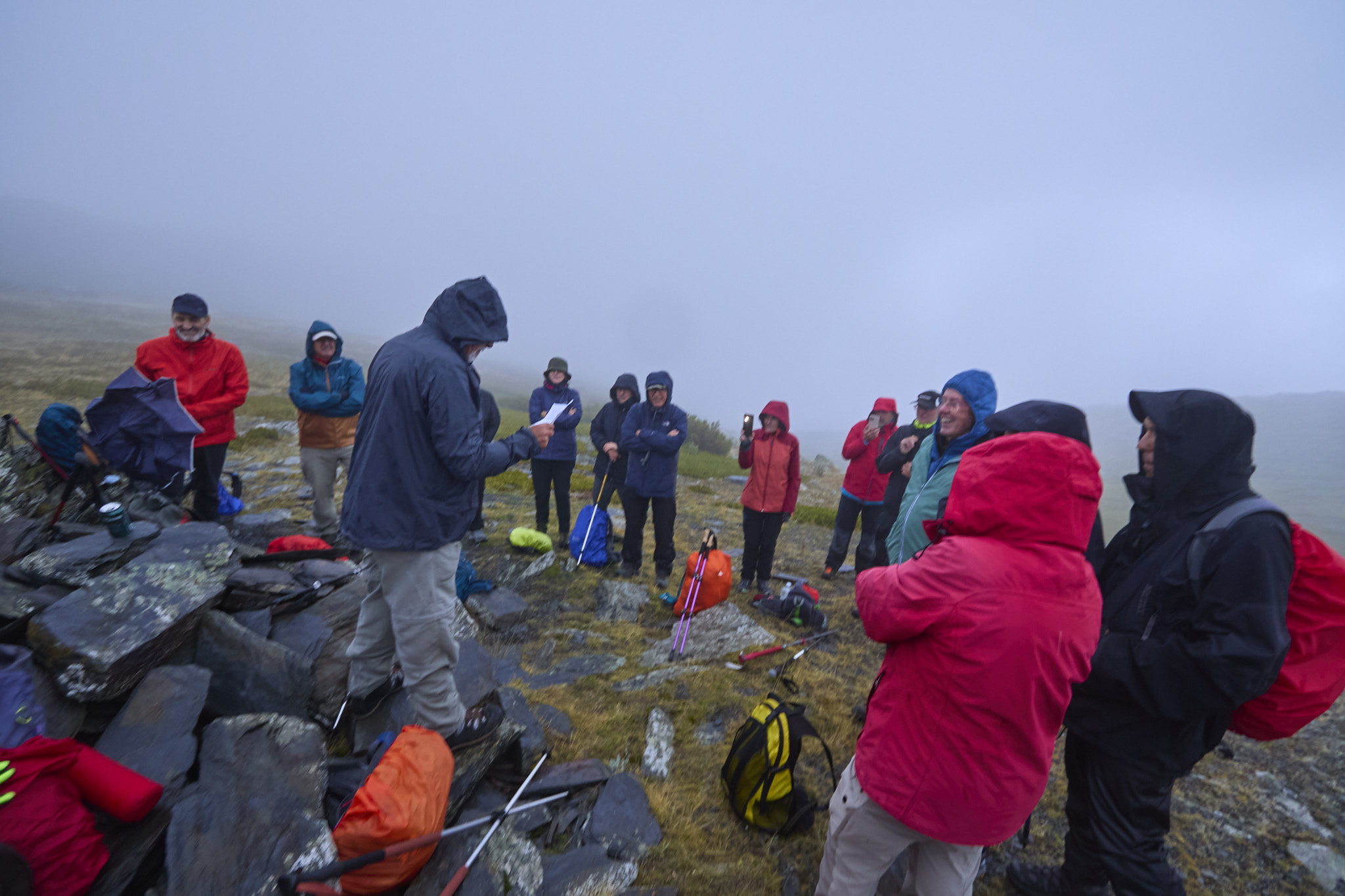 "Gran momento en la historia de Edutours. Esta foto de ayer la recordaremos siempre. No vemos en ella a El Edu y sin embargo está. Me gusta pensar que quiso hacernos saber su presencia en forma de lluvia. Subimos entre la niebla y robles de otoño hasta el collado anterior al Ocejoncillo, lugar elegido para el propósito que nos llevaba hasta allí. El Puma se disponía a leer una carta que dirigíamos a Edu y de repente se abrieron los cielos. Una lluvia intensa nos envolvió y aunque nuestro ilustre lector intentó imponer su impronta cómica, no pudo evitar emocionarse al término de su lectura y fue entonces cuando las lágrimas de algunos se mezclaron con la lluvia. Así fue como Edu nos dio su último abrazo"